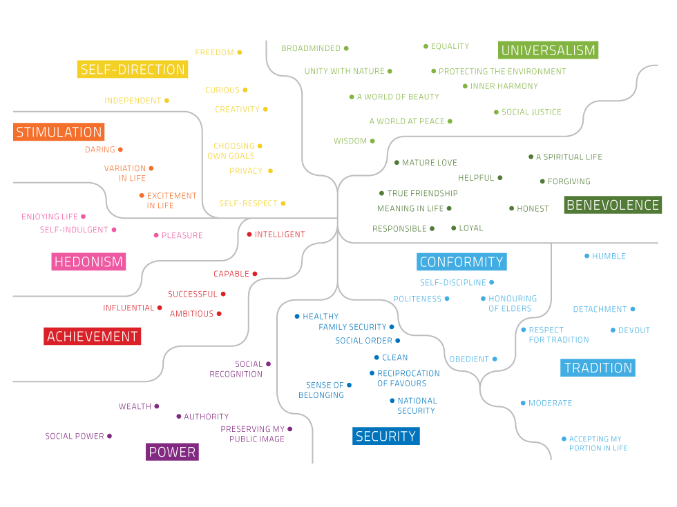 Have hope. Shalom Schwartz’s work alongside Gizelle Rhyon-Berry’s extensive comparative approach to diverse societies tells us there are tenets we know to be true that might serve as a compass in times of particular and impending resource constraints (see my other post delineating the interplay of the natural world and human life in ecological context). Particularly when survival-based reasoning, strategies, and tactics might make us blind to our own bigotry, we must own up to our own limits of cognitive and attributional complexity, empathy, responsive feeling, and self- and other-compassion. This is crucial but addressing bias, hierarchy, and privilege should be done systematically through experiential learning anchored by a framework of analysis for orientation and structure. Above all, it must create a culture of compassion, focussing on a purpose-driven goal of bringing about social justice and local and global flourishing, as lucidly and evocatively depicted in the documentaries from World Trust Institute. For a rare few, we see that this comes more easily. For others, based upon past traumas, societal conditioning, temperament, and other factors, education and spaces are required to practice dealing with conflict inherent in human relations. Methods and cross-cultural evidence already exist; the task is to shift the cluster of core values toward those which ameliorate and liberate (the values in the top half of the below spatial representation, which are preferentially opposed to the lower half). A majority of people across the globe already rank universalism, benevolence, and self-direction values at the top of their value preferences though social structures have not found a way to support these individual desires.
